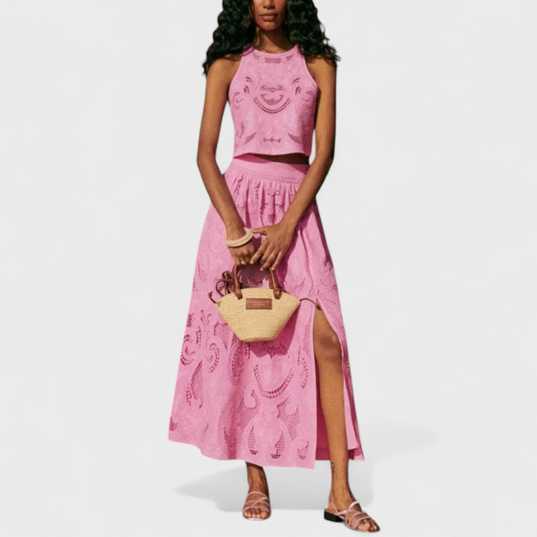 Con il suo delicato tessuto in pizzo, il sottile top con spalline e la gonna con spacco a vita alta, Olympe è chic, leggero e femminile. Indossatelo per una passeggiata estiva, un aperitivo al sole o un evento speciale: sarete disinvolte e comode. Il set può essere indossato insieme o separatamente, a seconda dello stile della giornata.